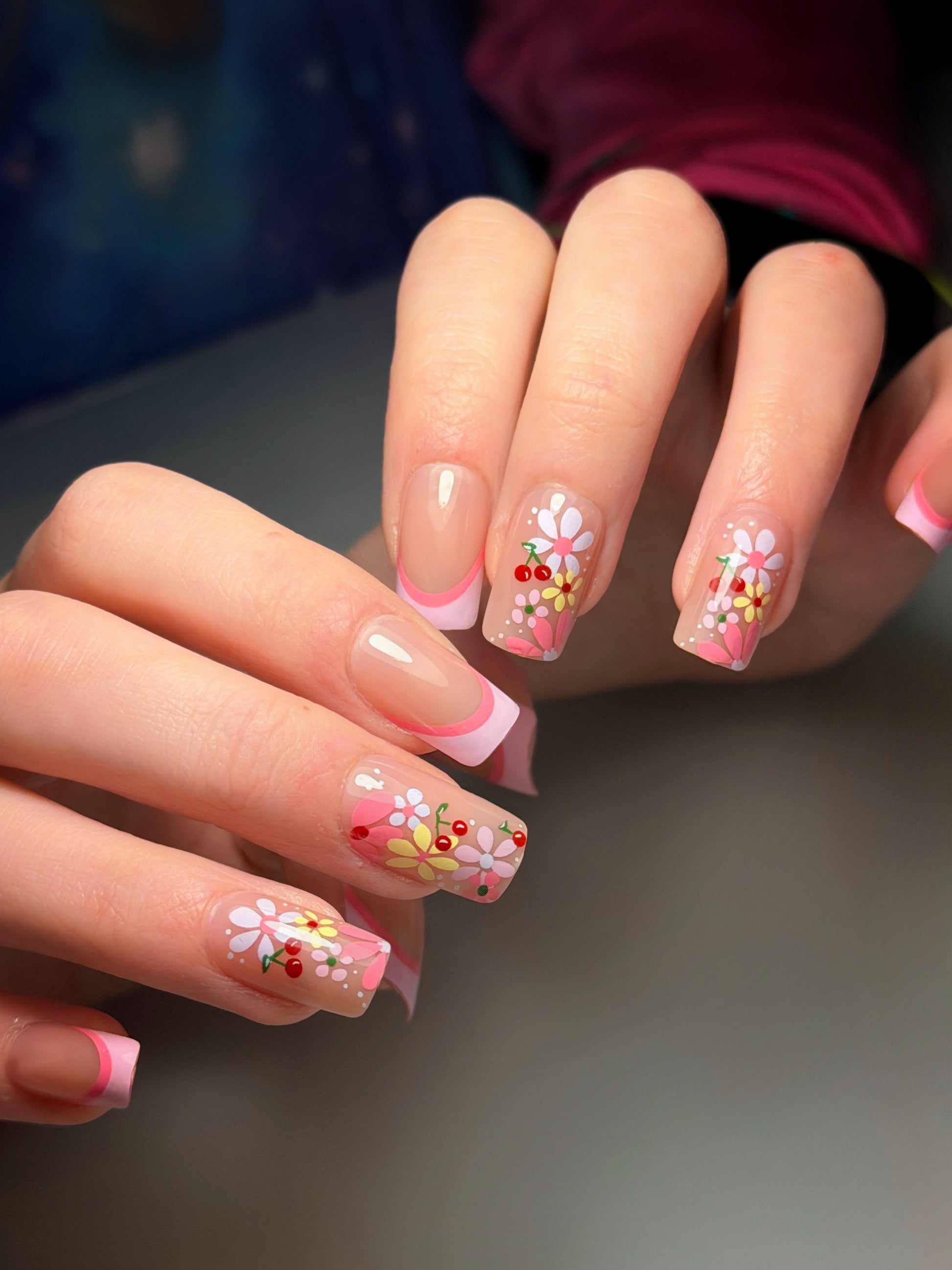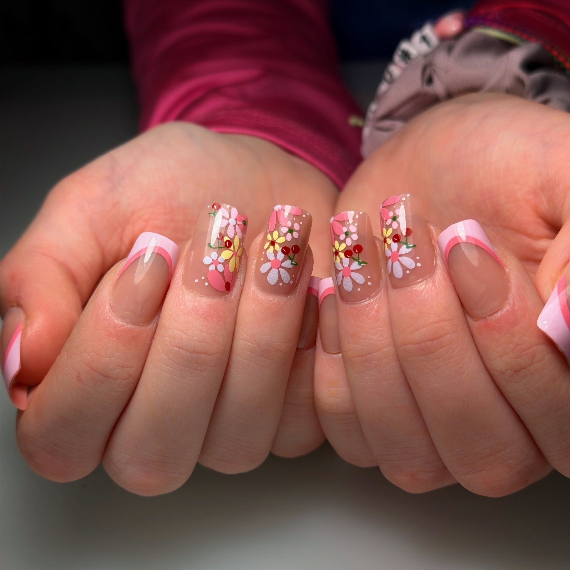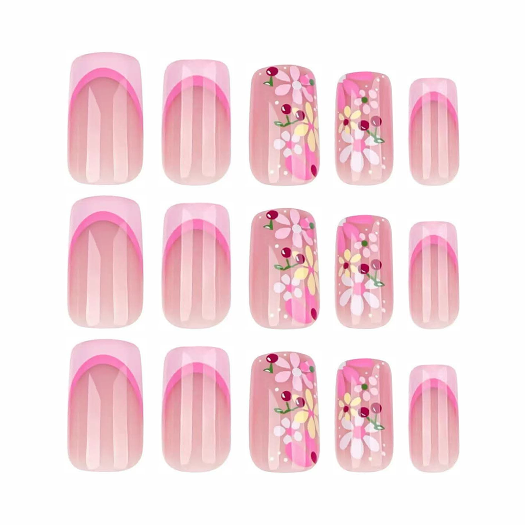 French with a twist! Soft light pink and bold dark pink French lines paired with a stunning floral accent nail. Fresh, flirty, and blooming with spring beauty.