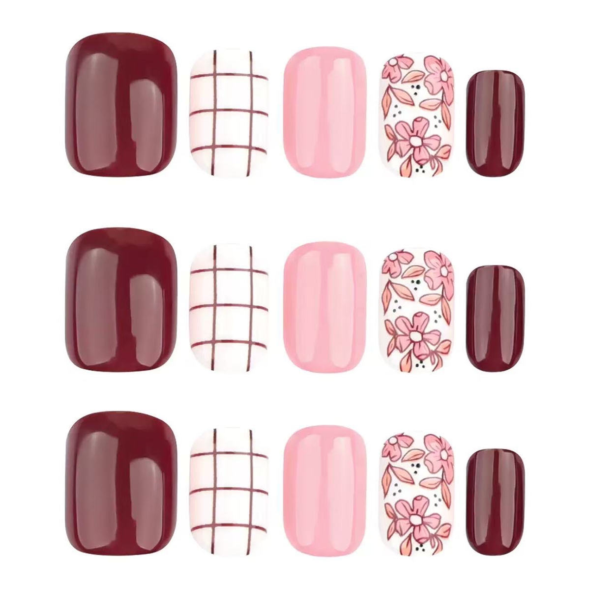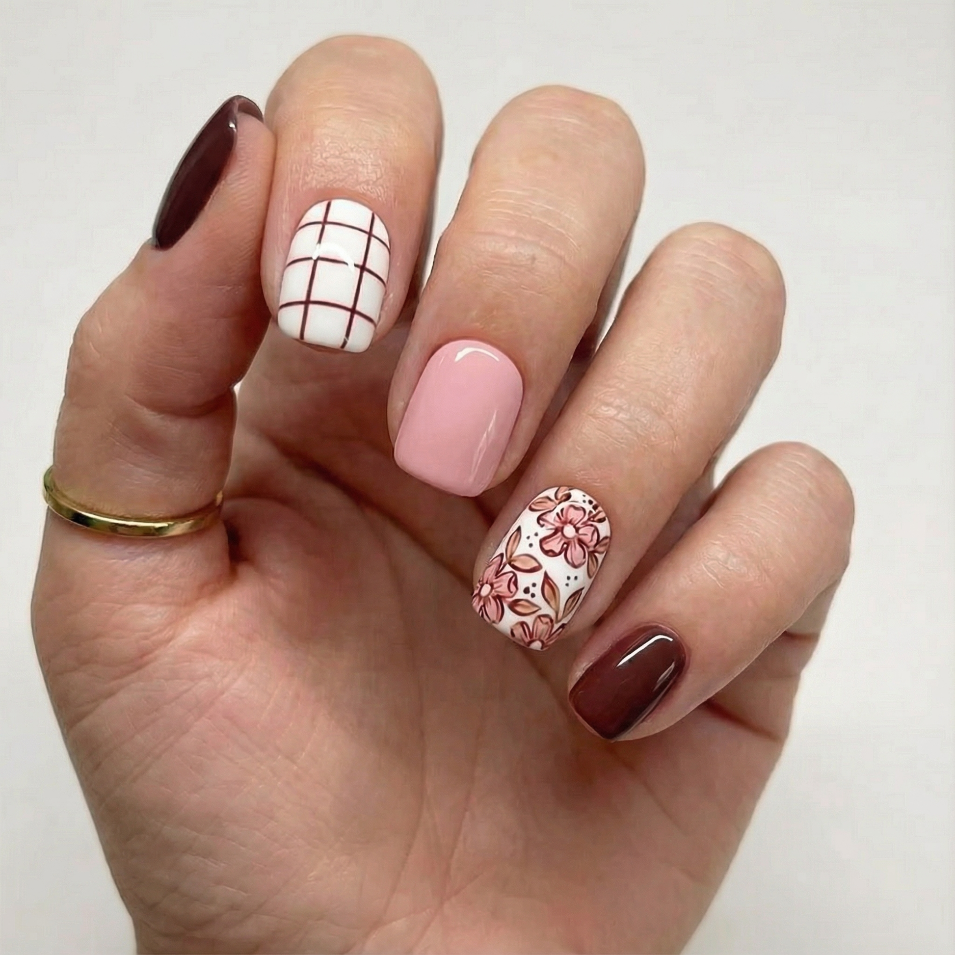 one stunning combination you won’t stop staring at. A gorgeous rose pink pairs beautifully with deep chocolate brown for a rich, elegant contrast. Finished with a chic white-and-brown checkered accent and soft floral detail nails, this set blends classic charm with modern flair. Bold, balanced, and effortlessly beautiful—this one is a true statement.