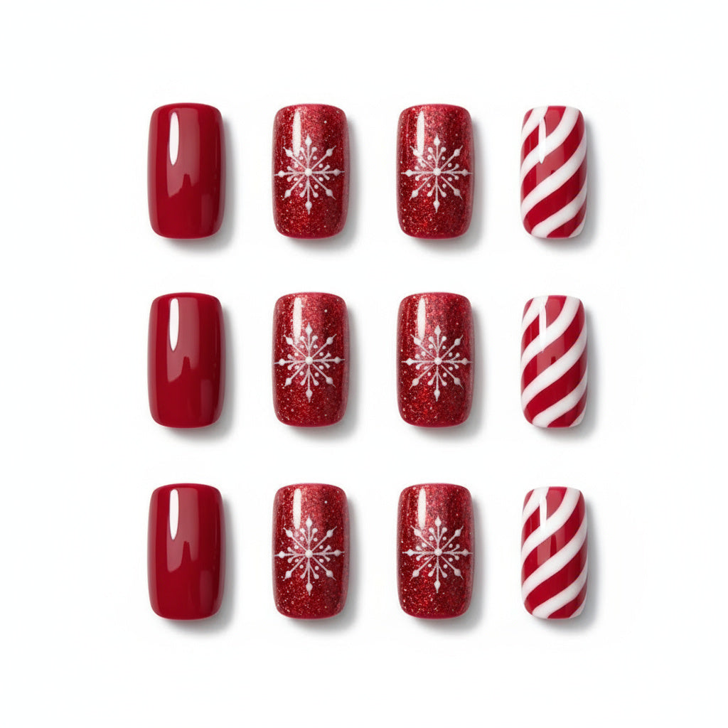 yep, let’s go! These are all things Christmas — a bold brick-red solid nail paired with a stunning mix of snowflake and candy cane nail art, all topped with red chrome embellishments for that extra holiday magic.