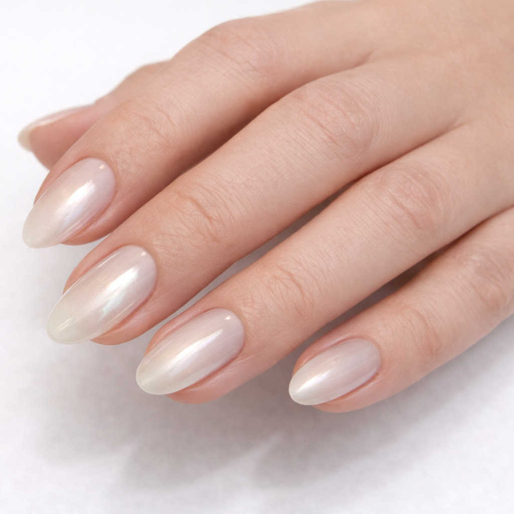 a luminous pearly chrome delicately layered over a classic white base, creating a soft, radiant glow that feels effortlessly polished, and beautifully timeless.