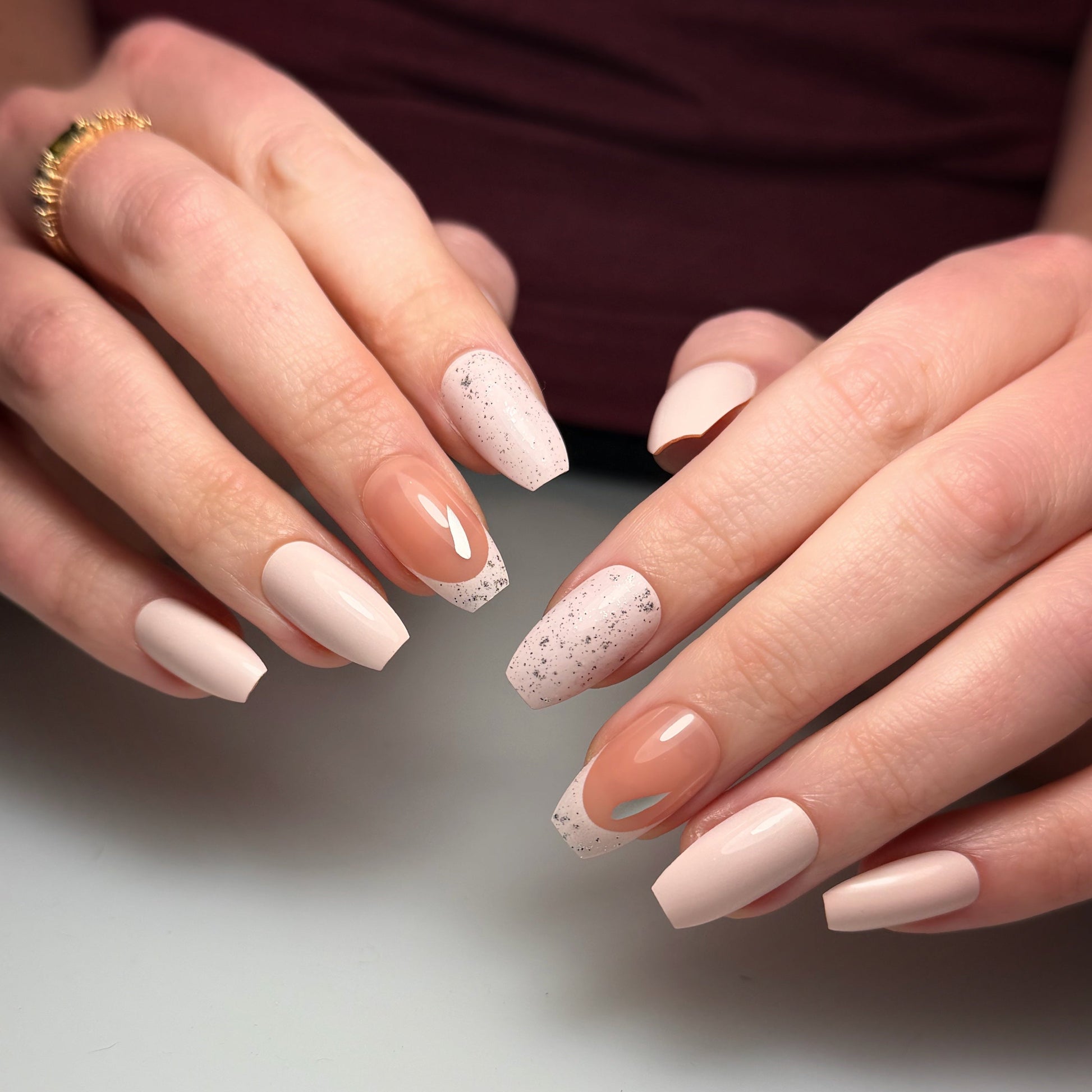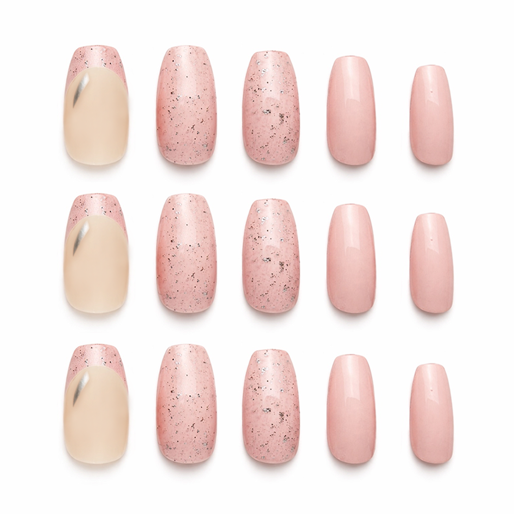 Such a stunning true rose pink that’s sweet with a little attitude. This set features elegant pink French tips paired with playful speckled accent nails dusted in sparkling silver glitter. Soft, classy, and just the right amount of savage.